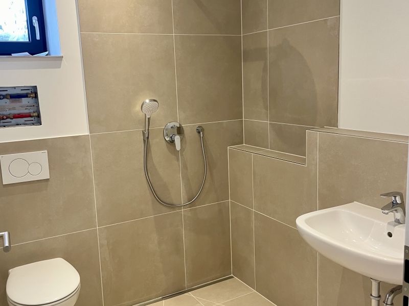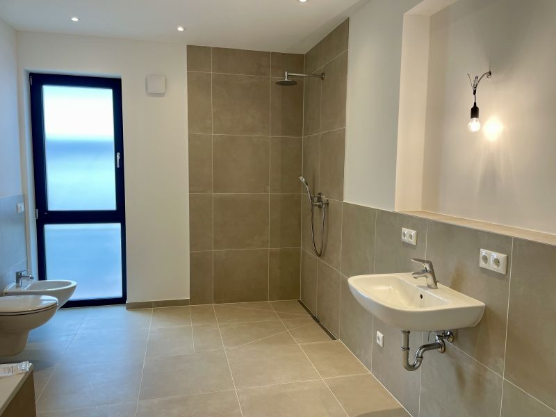 - + Duschbad mit bodenebener Dusche im Ostflügel